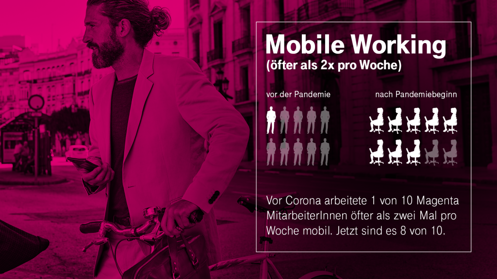 Magenta Telekom befragte im November 2020 die 2.400 Mitarbeiter*innen zu ihrem Mobilitätsverhalten. Die Ergebnisse der Magenta Pendlerstudie zeigen ganz klar, dass Corona ein massives Umdenken versursacht hat. Vor Ausbruch der Pandemie arbeitete nur einer von zehn Beschäftigten bei Magenta öfter als zwei Mal pro Woche von zu Hause. Seit Pandemiebeginn sind es acht von zehn, die verstärkt im Mobile Working sind. In den Shops, im Field Service oder im Netzausbau, wo Home Office nicht möglich ist, halten die Angestellten für den Dienst am Kunden die Stellung.